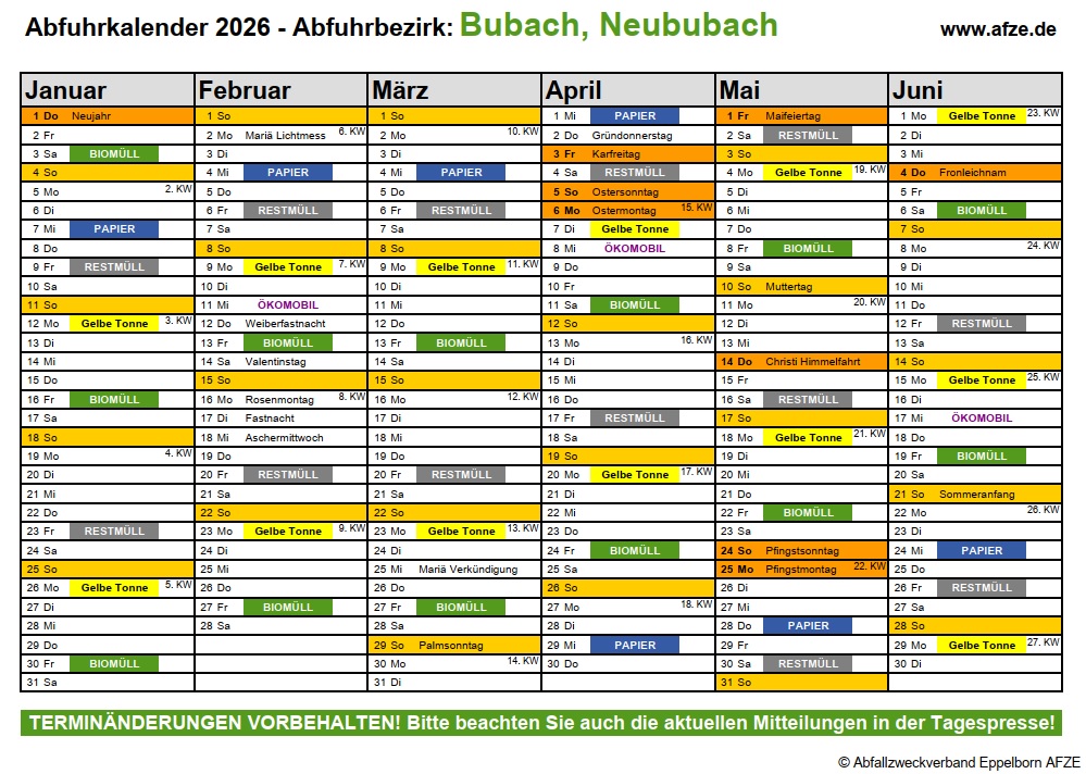 Hier finden Sie alle Abfuhrtermine in 2026 für die jeweiligen Abfuhrbezirke in übersichtlichen Jahreskalendern zum Ausdrucken: