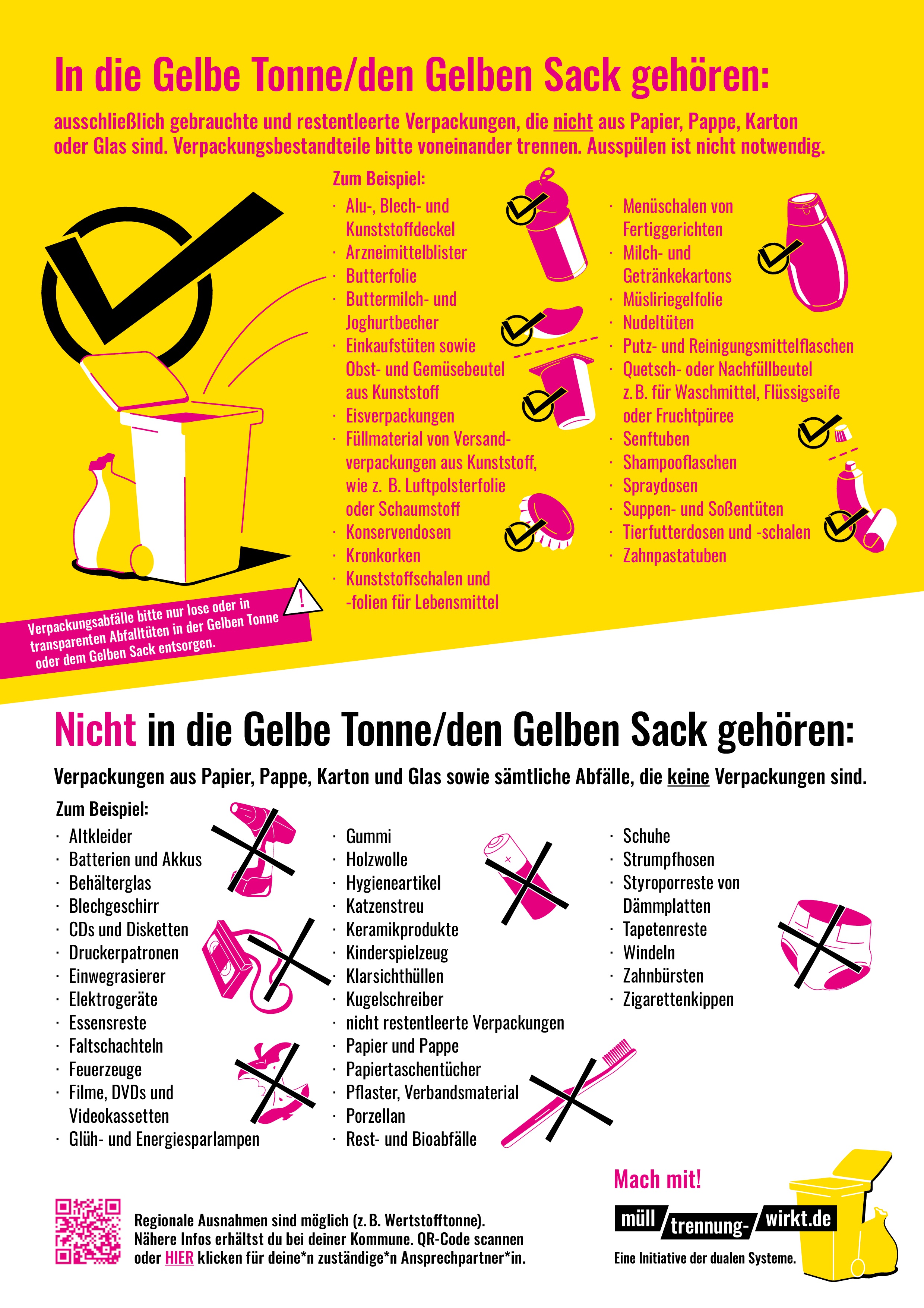 Noch immer ist die Meinung weit verbreitet, in die "gelbe Tonne" könne alles entsorgt werden, was aus Plastik ist. So werden häufig Plastikschüsseln, Styropordeckenplatten, Polsterschaumstoffe oder altes Spielzeug und sogar Regenschirme in die "gelbe Tonne" gesteckt und die Enttäuschung ist groß, wenn diese dann mit einem Aufkleber "falsch befüllt" versehen und nicht geleert wird.